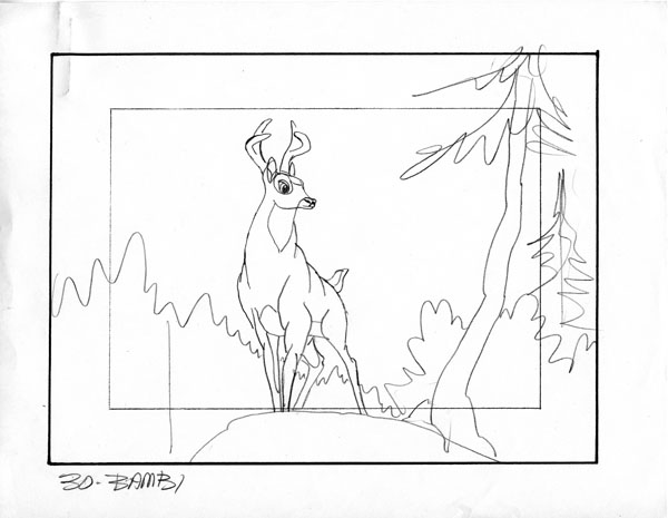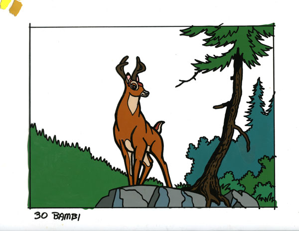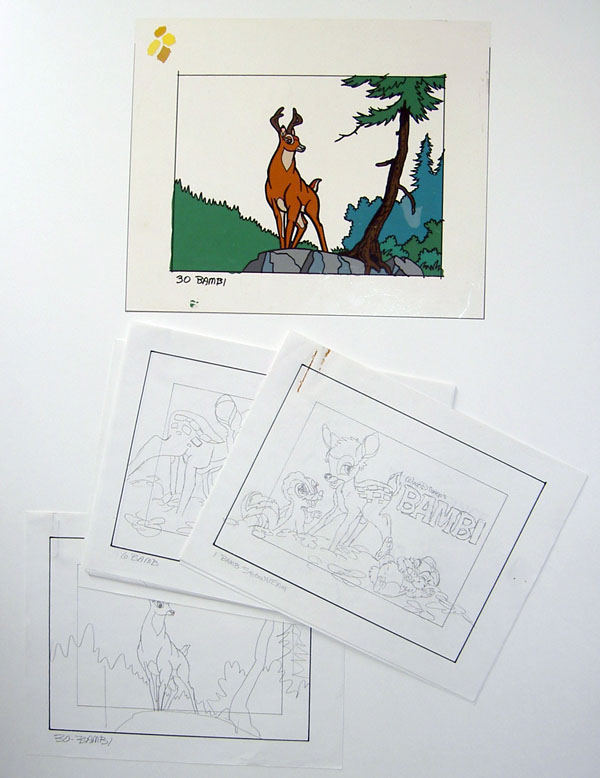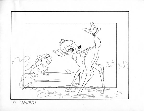 Bambi Storyboard and moreThis is a complete pencil drawn storyboard for the Bambi Show Beam film. It contains 30 8 1/2" X 11" pages each containing a single view for the story. This set also contains the colored cel for the final (30th) image, and an unopened Show Beam film of the story.