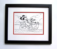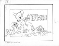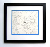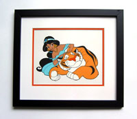 (click on each small picture to see more photos) 1. Muppet Babies unpainted cel, reel C, view 3, left image. Image size 1 0" X 9", film size 14" X 11". 2. Perils of Mickey unpainted cel, reel A, view 5, right image. Image size 10" X 9", film size 14" X 11". 3. Bambi Show Beam package. This is a neat set, all 30 pages of the Bambi Show Beam storyboard in pencil drawn sketches, plus the painted cel for the final view, plus the unopened Show Beam film! I hated to break up this set and sell the individual pieces, so it is going as a complete package. The pencil sketches are on 8 1/2" X 11" paper sheets. (Note: the first and last pages have rust marks on them from the paper clip that was holding the storyboard together. It can probably be cleaned, but I will leave it to the buyer.) The painted cel image size is 9" X 6 5/8", film size 12" X 10". 4. Beauty and the Beast painted cel, reel C, view 1, right image. Image size 10" X 9", film size 14" X 11". Image is marked "DO NOT USE" on the bottom and there are 3 areas on the forward bedpost that have small red letter D's on them (I assume that someone wanted these areas darker). 5. Mickey and the Seal ink master for cover art, framed. This is the drawing that the final painted cel was copied from to make the cover art for the Mickey and the Seal Show Beam package. You can see the package on eBay item number 160024808870. Outside dimensions of the frame are 16" X 13 1/2". There are several small stains on the paper, but are not noticeable. 6. Fraggle Rock unpainted cel, reel A, view 7, right image, framed. Outside dimensions of the frame are 15 1/4" X 16". 7. Aladdin color sheet (Jasmine and Rajah) framed. As each project reached the painting stage a color sheet was made to show the painters the correct colors for each of the characters. Outside dimensions of the frame are 16" X 14". |