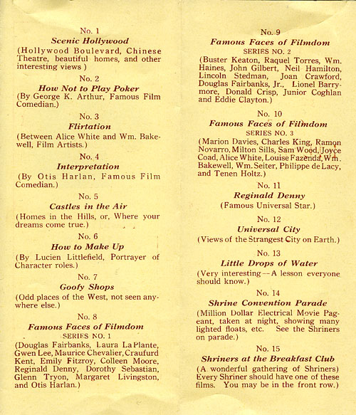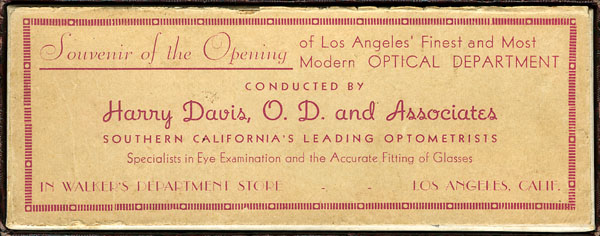 It is not known exactly what dates the viewer and films were made, but the movie stars pictured in some of the films were all active in the late twenties and early thirties (and of course, many long before and after that). Also, the last two films in the library sheet that I have are of a Shriners' convention, and there was a Shrines convention held in Los Angeles in 1929. A patent search may bring a more definite date (the viewer just says patent pending). The two viewers that I have seen both came in boxes that were labeled on the bottom "Souvenir of the opening of Los Angeles' finest and most modern optical department, conducted by Harry Davis, O.D. and Associates", but there were no films with either viewer. Both viewers came with operating instructions and a library sheet, but in one both sheets were the same size and in the other (the one that I purchased) the library sheet was taller indicating that the catalog of titles had been expanded mid-order for the optometrist.