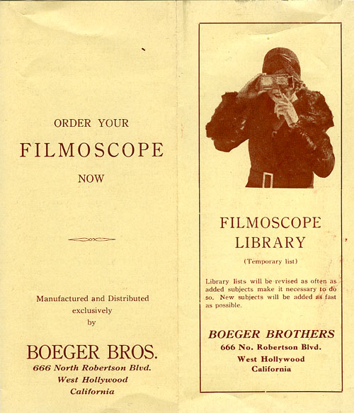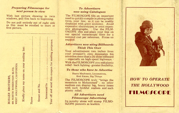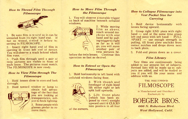 Tru-Vue and DeVry were not the first companies to create a stereo film viewer to view strips of 35mm film. A California based company, Boeger Brothers, created a metal folding viewer that they called "The Hollywood Filmoscope". The design was nice and compact, and mechanically it works well.