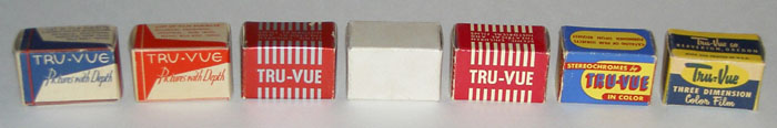 Over the years Tru-Vue changed the colors and styles of their film boxes to indicate to customers that something had changed. Frequently it was just a marketing ploy to get people interested in what was "new", however, for collectors some of the box styles will help them to more quickly identify types of films that they might be looking for. Although there were many minor differences in box designs the photo below shows the 7 main style changes that most collectors use for identification.