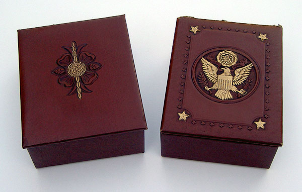 After World War II started, both labor and wood became very expensive, so Tru-Vue came up with a new design of library case. Using stiff cardboard as its base, the new cases were a simple box with a flat lid, all covered in vinyl. The tops had machine embossing of either a floral or patriotic eagle design. This embossing was usually painted with gold paint, but unpainted versions are often seen. The red viewer box bottoms were also used in this new design to hold the film boxes and viewer. The Tru-Vue name is embossed on the inside of the lid. I am giving these a start production date of 1942.