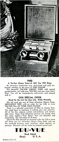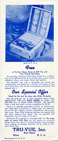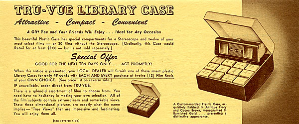 Shortly after Tru-Vue began selling their films and viewers, people started requesting storage cases specifically designed to keep their new treasures. At first Tru-Vue sold the cases outright. However, they quickly realized that they could sell more films if they offered the library cases as a premium. Over the years they had several types of promotions ranging from discounted cases, to free cases with a minimum purchase of films (usually 12 films).