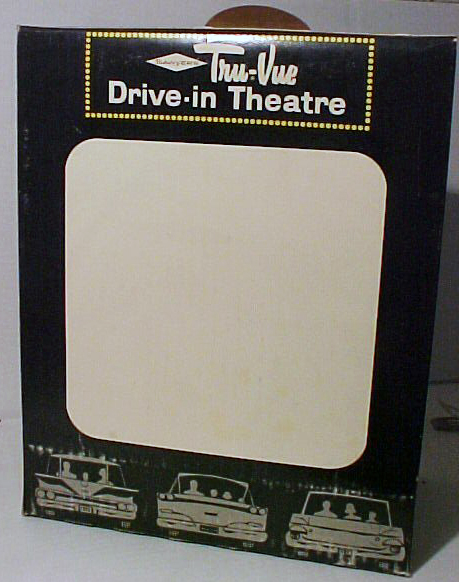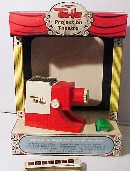Sawyers did realize that they were missing a potential market for the Tru-Vue brand by not having a projector for the cards. Their View-Master projectors were very popular, but to make a viewer large enough to fit the Tru-Vue cards would raise the sell point to a level similar to their View-Master projectors. In the late 1950's Sawyers came up with a solution to the large sized Tru-Vue projector problem by deciding to make special Tru-Vue cards that were only one half of the stereo pair. The small plastic projector was packaged with a set of themed mono film cards, and its cardboard packaging had a white "screen" on it that the children could use to project their slides on. There was only one model of the Sawyers Tru-Vue projector, but there were many different slide sets and packaging motifs made over the years. When Sawyers sold View-Master to GAF in 1967 the Tru-Vue view brand was retired, and no more Tru-Vue projectors were made.