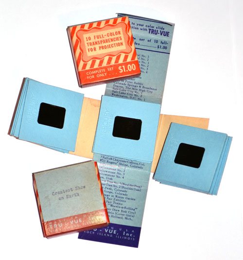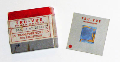 The first box of Tru-Vue slides that I came across were in a red and gray box (Tru-Vue started using in the mid-1940's). The box said that they were "Tru-Vue Photo Mounts" and that the 15 transparencies were "For Projection" (the 15th slide was the title frame). The slides themselves were labeled "Tru-Vue Incorporated" and had a red dot in the lower left corner to indicate to the projectionist how to orient the slide in the projector (he turns it over so that the mark is in the upper right for projection).